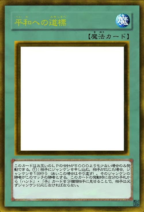 | このカードはお互いのLPの合計が5000よりも少ない場合のみ発動できる。①:相手にジャンケンを申し込む。相手が応じた場合、ジャンケンを1回行う(あいこの場合はやり直す)。そのジャンケンの勝者がこのマッチの勝者とする。このカードの発動時に自分の手札から「ハンド」・「手」カードを3種類相手に見せることで、相手は必ずジャンケンに応じなければならない。 | |||