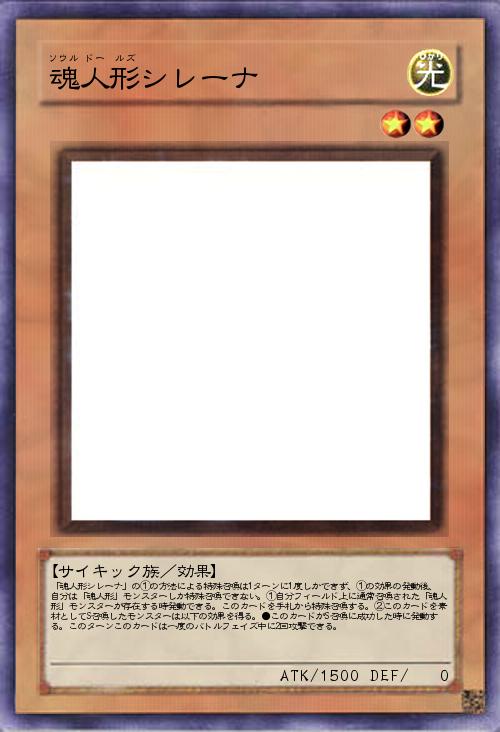| 「魂人形シレーナ」の①の方法による特殊召喚は1ターンに1度しかできず、①の効果の発動後、自分は「魂人形」モンスターしか特殊召喚できない。①自分フィールド上に通常召喚された「魂人形」モンスターが存在する時発動できる。このカードを手札から特殊召喚する。②このカードを素材としてS召喚したモンスターは以下の効果を得る。●このカードがS召喚に成功した時に発動する。このターンこのカードは一度のバトルフェイズ中に2回攻撃できる。 | |||