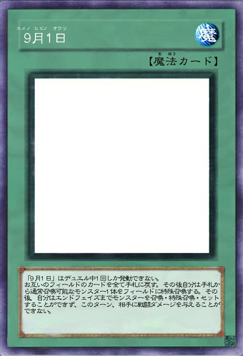 | 「9月1日」はデュエル中1回しか発動できない。 お互いのフィールドのカードを全て手札に戻す。その後自分は手札から通常召喚可能なモンスター1体をフィールドに特殊召喚する。その後、自分はエンドフェイズまでモンスターを召喚・特殊召喚・セットすることができず、このターン、相手に戦闘ダメージを与えることができない。 | |||