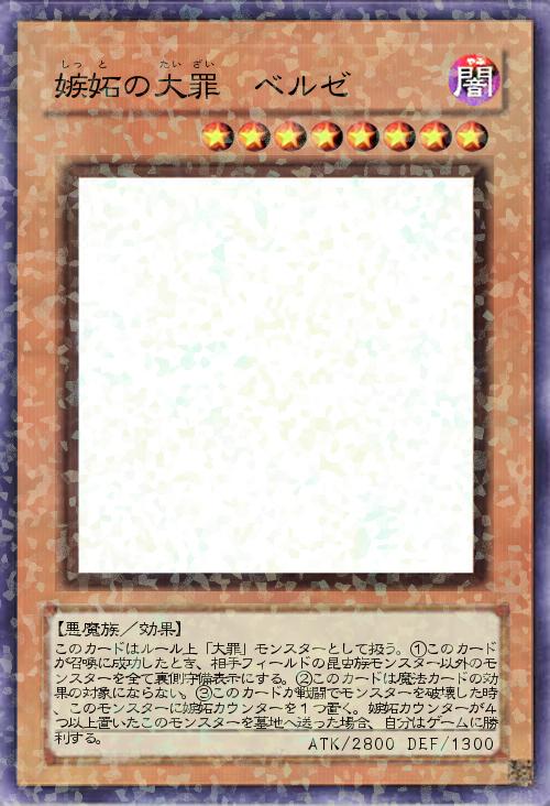| このカードはルール上「大罪」モンスターとして扱う。①このカードが召喚に成功したとき、相手フィールドの昆虫族モンスター以外のモンスターを全て裏側守備表示にする。②このカードは魔法カードの効果の対象にならない。③このカードが戦闘でモンスターを破壊した時、このモンスターに嫉妬カウンターを1つ置く。嫉妬カウンターが4つ以上置いたこのモンスターを墓地へ送った場合、自分はゲームに勝利する。 | |||