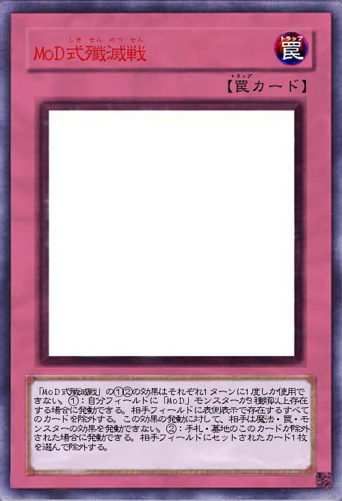| 「MoD式殲滅戦」の①②の効果はそれぞれ1ターンに1度しか使用できない。①:自分フィールドに「MoD」モンスターが3種類以上存在する場合に発動できる。相手フィールドに表側表示で存在するすべてのカードを除外する。この効果の発動に対して、相手は魔法・罠・モンスターの効果を発動できない。②:手札・墓地のこのカードが除外された場合に発動できる。相手フィールドにセットされたカード1枚を選んで除外する。 | |||