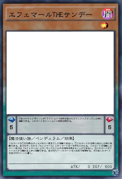 | このカードの①の効果はデュエル中に一度までしか発動できない。①このカードの召喚に成功した時に発動できる。自分のデッキから「エフェマール」と付くカードを1枚手札に加える。このカードを発動したターン自分は「エフェマール」と付くモンスター以外を特殊召喚することができない。②このカードがフィールドから離れるときに発動できる。自分のPゾーンのカードを二枚まで破壊する。その後このカードを自分のPゾーンに置く。 | |||