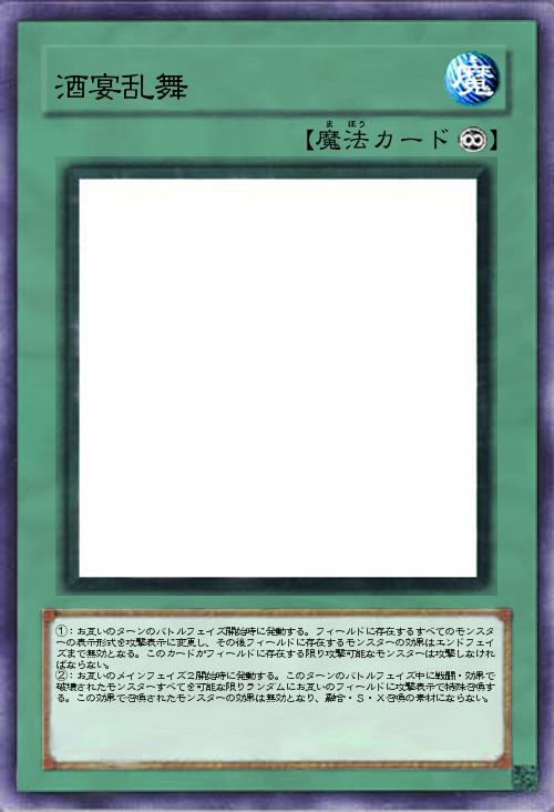 | ①:お互いのターンのバトルフェイズ開始時に発動する。フィールドに存在するすべてのモンスターの表示形式を攻撃表示に変更し、その後フィールドに存在するモンスターの効果はエンドフェイズまで無効となる。このカードがフィールドに存在する限り攻撃可能なモンスターは攻撃しなければならない。 ②:お互いのメインフェイズ2開始時に発動する。このターンのバトルフェイズ中に戦闘・効果で破壊されたモンスターすべてを可能な限りランダムにお互いのフィールドに攻撃表示で特殊召喚する。この効果で召喚されたモンスターの効果は無効となり、融合・S・X召喚の素材にならない。 | |||