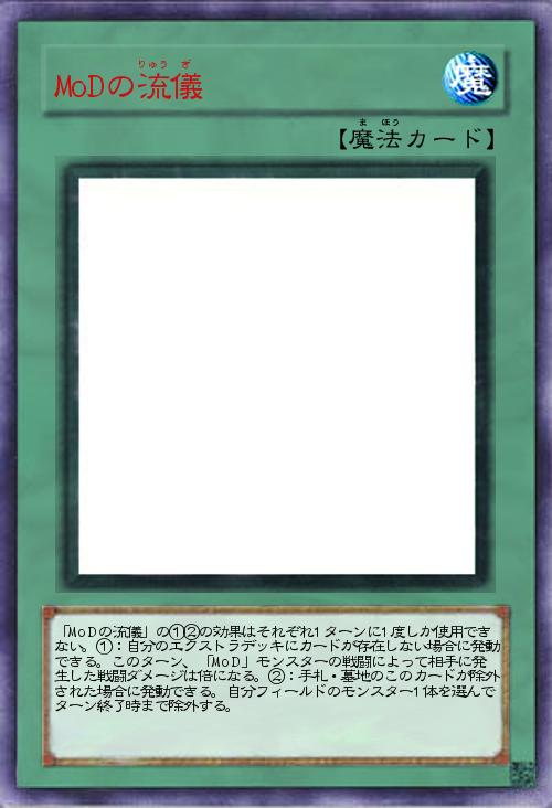 | 「MoDの流儀」の①②の効果はそれぞれ1ターンに1度しか使用できない。①:自分のエクストラデッキにカードが存在しない場合に発動できる。このターン、「MoD」モンスターの戦闘によって相手に発生した戦闘ダメージは倍になる。②:手札・墓地のこのカードが除外された場合に発動できる。自分フィールドのモンスター1体を選んでターン終了時まで除外する。 | |||