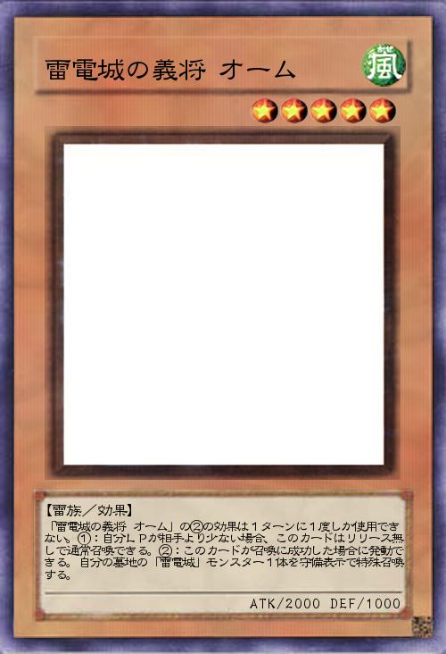 | 「雷電城の義将 オーム」の②の効果は1ターンに1度しか使用できない。①:自分LPが相手より少ない場合、このカードはリリース無しで通常召喚できる。②:このカードが召喚に成功した場合に発動できる。自分の墓地の「雷電城」モンスター1体を守備表示で特殊召喚する。 | |||