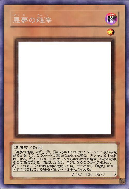 | 「悪夢の残滓」の①、②、③の効果はそれぞれ1ターンに1度のみ発動できる。①:このカードが墓地に送られた場合、デッキから1枚ドローする。②:このカードがゲームから除外された場合、相手の手札を全て確認できる。確認した場合、自分は2000ライフを失う。 ③:このカードが特殊召喚に成功した時、デッキから「悪夢」がカード名に含まれている魔法・罠カードを手札に加える。 | |||