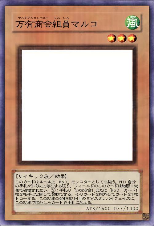 | このカードはルール上「MoD」モンスターとしても扱う。①:自分の手札が3枚以上存在する限り、フィールドのこのカードは戦闘・効果で破壊されない。②:手札の「万有商会」または「MoD」カード1枚を相手に公開して発動できる。そのカードを除外してカードを1枚ドローする。この効果の発動後2回目の自分スタンバイフェイズに、この効果で除外したカードを手札に加える。 | |||