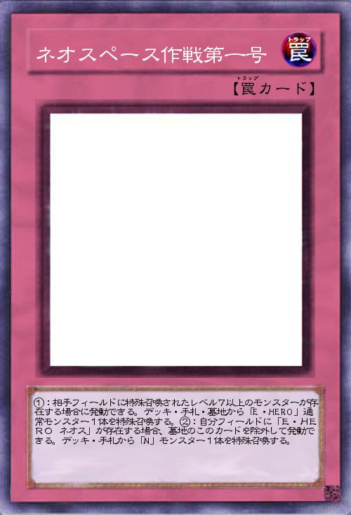 | ①:相手フィールドに特殊召喚されたレベル7以上のモンスターが存在する場合に発動できる。デッキ・手札・墓地から「E・HERO」通常モンスター1体を特殊召喚する。②:自分フィールドに「E・HERO ネオス」が存在する場合、墓地のこのカードを除外して発動できる。デッキ・手札から「N」モンスター1体を特殊召喚する。 | |||