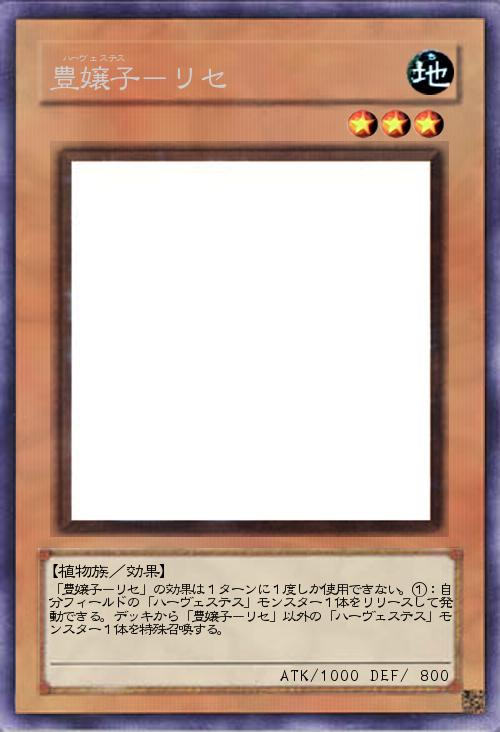 | 「豊嬢子-リセ」の効果は1ターンに1度しか使用できない。①:自分フィールドの「ハーヴェステス」モンスター1体をリリースして発動できる。デッキから「豊嬢子-リセ」以外の「ハーヴェステス」モンスター1体を特殊召喚する。 | |||