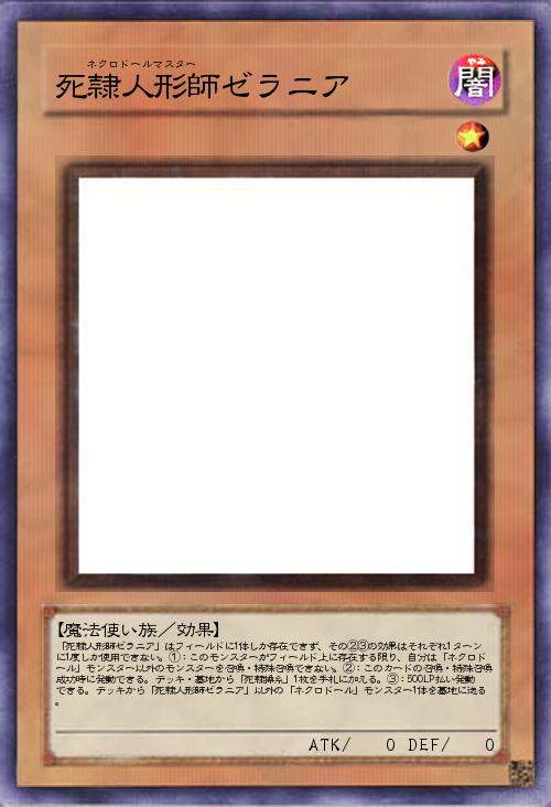 | 「死隷人形師ゼラニア」はフィールドに1体しか存在できず、その②③の効果はそれぞれ1ターンに1度しか使用できない。①:このモンスターがフィールド上に存在する限り、自分は「ネクロドール」モンスター以外のモンスターを召喚・特殊召喚できない。②:このカードの召喚・特殊召喚成功時に発動できる。デッキ・墓地から「死隷操糸」1枚を手札に加える。③:500LP払い発動できる。デッキから「死隷人形師ゼラニア」以外の「ネクロドール」モンスター1体を墓地に送る。 | |||