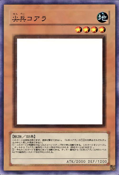 | このカードは特殊召喚できず、直接攻撃をできない。「尖兵コアラ」の①②の効果はそれぞれデュエル中に1度しか使用できない。 ①:このカードが戦闘を行なったダメージステップ終了時に発動できる。このカードをリリースし、デッキから「コアラ」獣族モンスター2体を手札に加える(同名カードは1枚まで)。 ②:手札のこのカードを墓地に送って発動できる。デッキ・墓地から「尖兵コアラ」以外のレベル4以下の獣族モンスター1体を手札に加える。 | |||