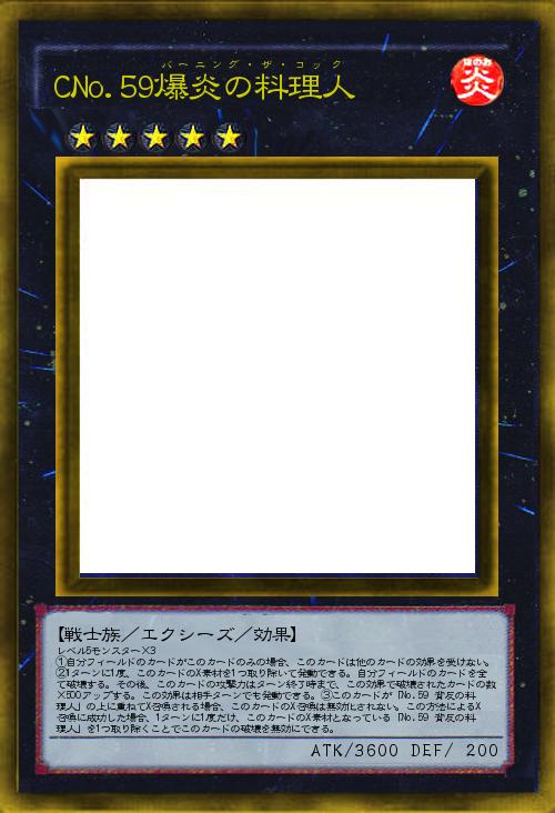 | レベル5モンスター×3 ①自分フィールドのカードがこのカードのみの場合、このカードは他のカードの効果を受けない。②1ターンに1度、このカードのX素材を1つ取り除いて発動できる。自分フィールドのカードを全て破壊する。その後、このカードの攻撃力はターン終了時まで、この効果で破壊されたカードの数×500アップする。この効果は相手ターンでも発動できる。③このカードが「No.59 背反の料理人」の上に重ねてX召喚される場合、このカードのX召喚は無効化されない。この方法によるX召喚に成功した場合、1ターンに1度だけ、このカードのX素材となっている「No.59 背反の料理人」を1つ取り除くことでこのカードの破壊を無効にできる。 | |||