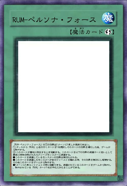 | 「RUM-ペルソナ・フォース」の①の効果は1ターンに1度しか使用できない。 ①:デッキから「RUM」と名の付くカードを1枚選択しそのカードの効果を適応した後、ゲームから除外する。 ②:このカードが墓地に存在するとき発動する。このカードを以下の効果の装備カード扱いとして最後に特殊召喚されたエクシーズモンスターに装備する。 ●このカードを装備しているモンスターの効果は無効化される。 ●このカードを装備したモンスターが自分フィールドを離れる時、その効果を無効にし破壊する。その後このカードをゲームから除外する。 ●1ターンに1度エンドフェイズ時に発動できる。装備されているこのカードをゲームから除外し、除外されている「RUM」カード1枚を手札に加えることができる。 | |||