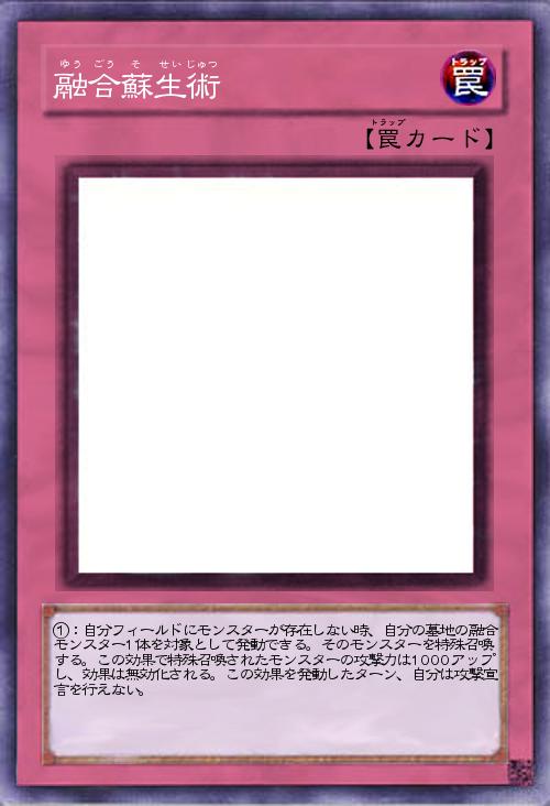 | ①:自分フィールドにモンスターが存在しない時、自分の墓地の融合モンスター1体を対象として発動できる。そのモンスターを特殊召喚する。この効果で特殊召喚されたモンスターの攻撃力は1000アップし、効果は無効化される。この効果を発動したターン、自分は攻撃宣言を行えない。 | |||