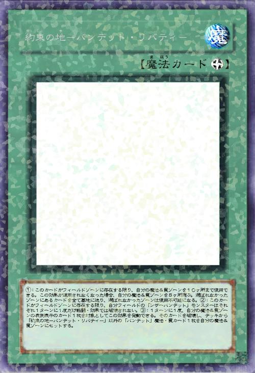 | ①:このカードがフィールドゾーンに存在する限り、自分の魔法&罠ゾーンを10ヶ所まで使用できる。この効果が適用されなくなった場合、自分の魔法&罠ゾーンを5ヶ所選ぶ。選ばれなかったゾーンにあるカードを全て墓地に送り、選ばれなかったゾーンは使用不可能になる。②:このカードがフィールドゾーンに存在する限り、自分フィールドの「シザーバンデット」モンスターはそれぞれ1ターンに1度だけ戦闘・効果では破壊されない。③:1ターンに1度、自分の魔法&罠ゾーンの表側表示のカード1枚を対象としてこの効果を発動できる。そのカードを破壊し、デッキから「約束の地-バンデット・リバティ-」以外の「バンデット」魔法・罠カード1枚を自分の魔法&罠ゾーンにセットする。 | |||