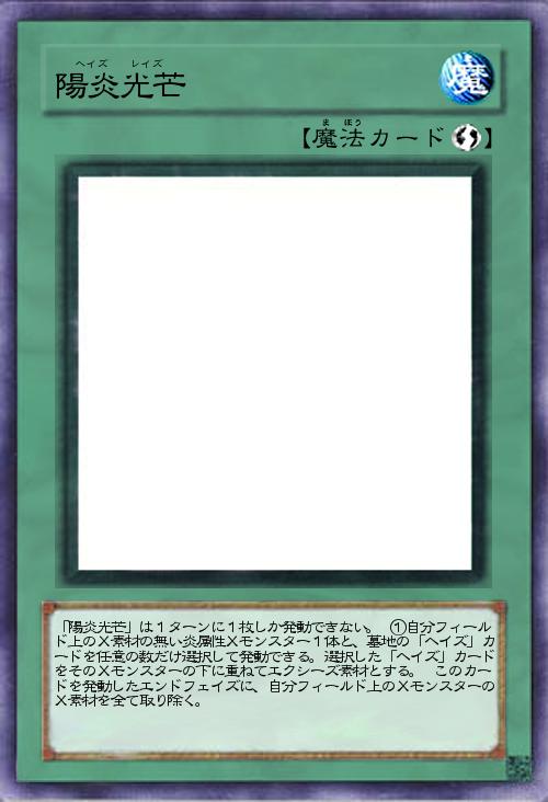 | 「陽炎光芒」は1ターンに1枚しか発動できない。 ①自分フィールド上のX素材の無い炎属性Xモンスター1体と、墓地の「ヘイズ」カードを任意の数だけ選択して発動できる。選択した「ヘイズ」カードをそのXモンスターの下に重ねてエクシーズ素材とする。 このカードを発動したエンドフェイズに、自分フィールド上のXモンスターのX素材を全て取り除く。 | |||