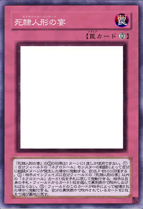 | 「死隷人形の宴」の②の効果は1ターンに1度しか使用できない。①:自分フィールドの「ネクロドール」モンスターの戦闘によって自分に戦闘ダメージが発生した場合に発動する。自分LPを500回復する。②:相手メインフェイズに自分フィールドの「死隷人形の宴」以外の「ネクロドール」カード1枚を手札に戻して発動できる。相手は自身の手札・フィールドからカード1枚を選んで裏側表示で除外しなければならない。③:フィールドのこのカードが相手によって破壊された場合に発動できる。自分の裏側表示で除外されているカードを2枚まで選び墓地に戻す。 | |||