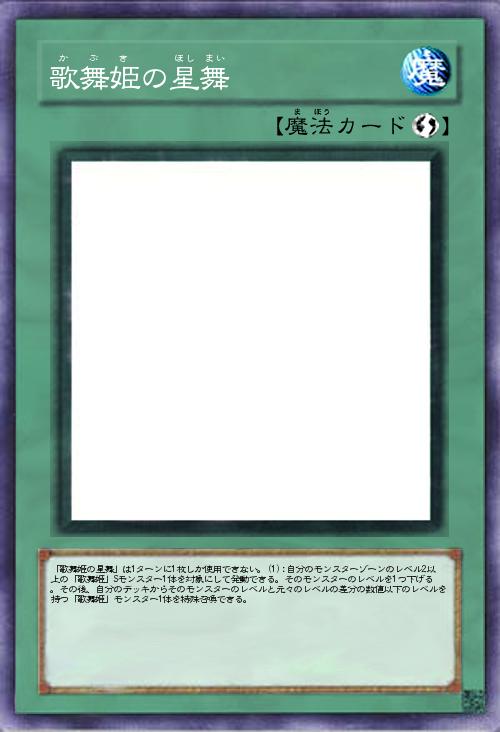 | 「歌舞姫の星舞」は1ターンに1枚しか使用できない。(1):自分のモンスターゾーンのレベル2以上の「歌舞姫」Sモンスター1体を対象にして発動できる。そのモンスターのレベルを1つ下げる。その後、自分のデッキからそのモンスターのレベルと元々のレベルの差分の数値以下のレベルを持つ「歌舞姫」モンスター1体を特殊召喚できる。 | |||