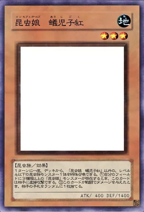 | 1ターンに一度、デッキから、「昆虫娘 蟻児子紅」以外の、レベル4以下の昆虫族モンスター1体を特殊召喚できる。①自分のフィールドに3種類以上の「昆虫娘」モンスターが存在するとき、このカードは相手に直接攻撃できる。②このカードが戦闘でダメージを与えたとき、相手の手札をランダムに1枚捨てる。 | |||