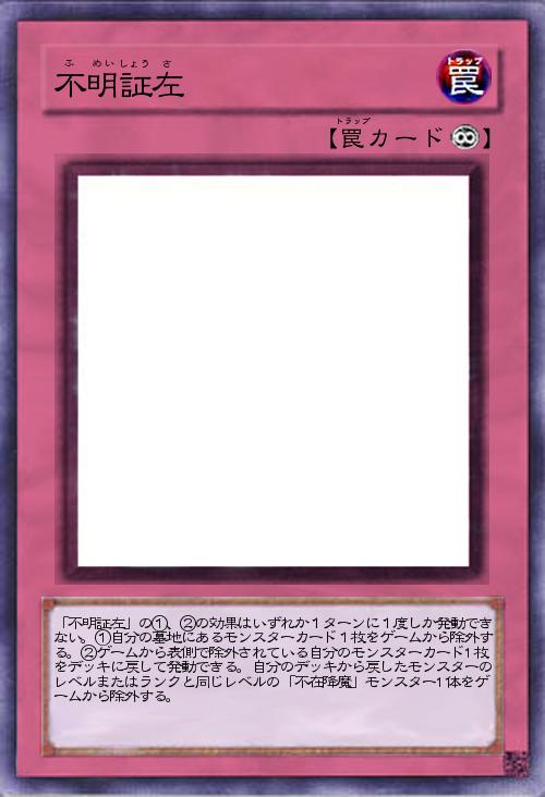 | 「不明証左」の①、②の効果はいずれか1ターンに1度しか発動できない。①自分の墓地にあるモンスターカード1枚をゲームから除外する。②ゲームから表側で除外されている自分のモンスターカード1枚をデッキに戻して発動できる。自分のデッキから戻したモンスターのレベルまたはランクと同じレベルの「不在降魔」モンスター1体をゲームから除外する。 | |||