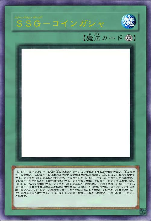 | 「SSG-コインガシャ」の②・③の効果は1ターンにいずれか1度しか発動できない。①このカードの発動と、このカードの効果および効果の発動は無効にされない。②300LP払って発動できる。デッキからランダムに1枚を選び、そのカードが「SSG」モンスターカードだった場合、そのカードを手札に加えるか特殊召喚できる。そうでない場合、そのカードをデッキに戻す。③3000LP払って発動できる。デッキからランダムに10枚を選び、そのうちの「SSG」モンスターカード1枚を手札に加えるか特殊召喚できる。この時、10枚のうちに「スーパーレア」または「ダブルスーパーレア」と名のつくカードが1枚以上存在した場合、その中から1枚を選択し、手札に加えることができる。「SSG」モンスターが存在しなかった場合、それらのカードをデッキに戻す。 | |||