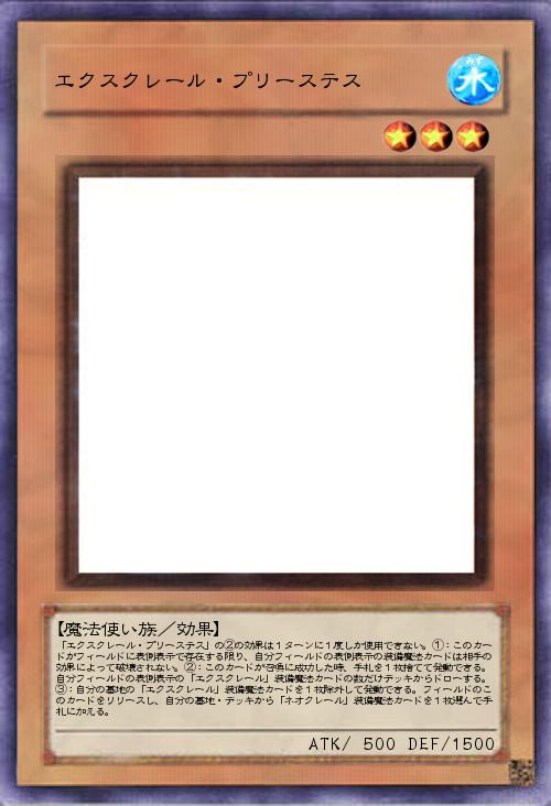 | 「エクスクレール・プリーステス」の②の効果は1ターンに1度しか使用できない。①:このカードがフィールドに表側表示で存在する限り、自分フィールドの表側表示の装備魔法カードは相手の効果によって破壊されない。②:このカードが召喚に成功した時、手札を1枚捨てて発動できる。自分フィールドの表側表示の「エクスクレール」装備魔法カードの数だけデッキからドローする。③:自分の墓地の「エクスクレール」装備魔法カードを1枚除外して発動できる。フィールドのこのカードをリリースし、自分の墓地・デッキから「ネオクレール」装備魔法カードを1枚選んで手札に加える。 | |||