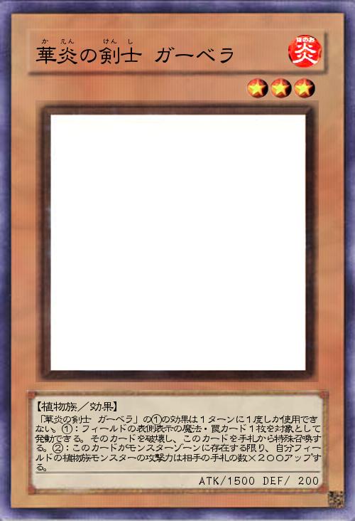| 「華炎の剣士 ガーベラ」の①の効果は1ターンに1度しか使用できない。①:フィールドの表側表示の魔法・罠カード1枚を対象として発動できる。そのカードを破壊し、このカードを手札から特殊召喚する。②:このカードがモンスターゾーンに存在する限り、自分フィールドの植物族モンスターの攻撃力は相手の手札の数×200アップする。 | |||