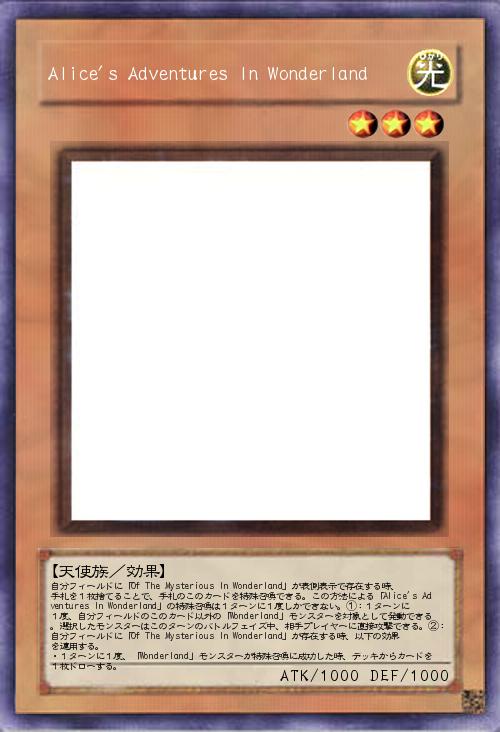 | 自分フィールドに「Of The Mysterious In Wonderland」が表側表示で存在する時、手札を1枚捨てることで、手札のこのカードを特殊召喚できる。この方法による「Alice's Adventures In Wonderland」の特殊召喚は1ターンに1度しかできない。①:1ターンに1度、自分フィールドのこのカード以外の「Wonderland」モンスターを対象として発動できる。選択したモンスターはこのターンのバトルフェイズ中、相手プレイヤーに直接攻撃できる。②:自分フィールドに「Of The Mysterious In Wonderland」が存在する時、以下の効果を適用する。 ・1ターンに1度、「Wonderland」モンスターが特殊召喚に成功した時、デッキからカードを1枚ドローする。 | |||