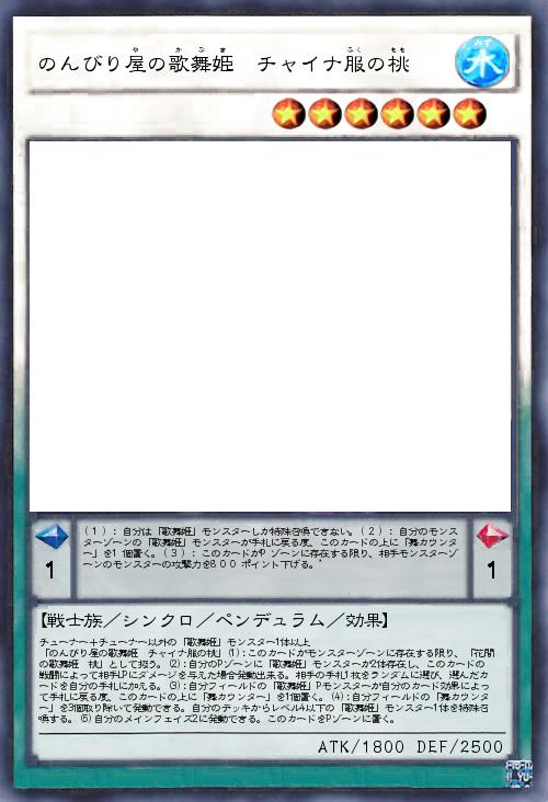 | チューナー+チューナー以外の「歌舞姫」モンスター1体以上 「のんびり屋の歌舞姫 チャイナ服の桃」(1):このカードがモンスターゾーンに存在する限り、「花間の歌舞姫 桃」として扱う。(2):自分のPゾーンに「歌舞姫」モンスターが2体存在し、このカードの戦闘によって相手LPにダメージを与えた場合発動出来る。相手の手札1枚をランダムに選び、選んだカードを自分の手札に加える。(3):自分フィールドの「歌舞姫」Pモンスターが自分のカード効果によって手札に戻る度、このカードの上に「舞カウンター」を1個置く。(4):自分フィールドの「舞カウンター」を3個取り除いて発動できる。自分のデッキからレベル4以下の「歌舞姫」モンスター1体を特殊召喚する。(5)自分のメインフェイズ2に発動できる。このカードをPゾーンに置く。 | |||