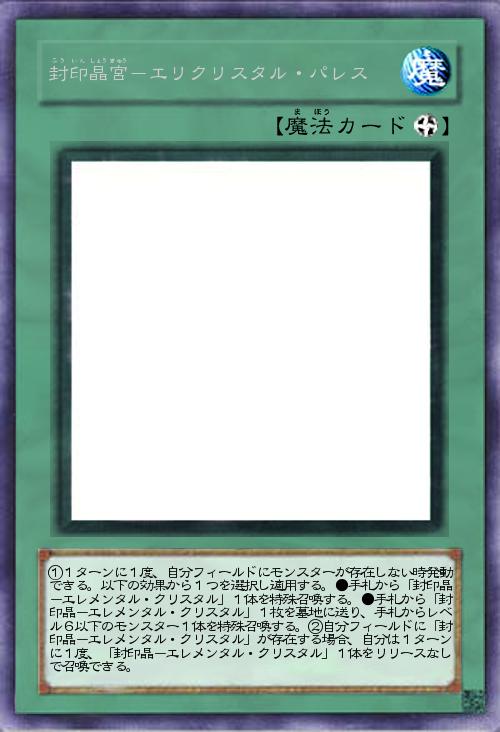 | ①1ターンに1度、自分フィールドにモンスターが存在しない時発動できる。以下の効果から1つを選択し適用する。●手札から「封印晶-エレメンタル・クリスタル」1体を特殊召喚する。●手札から「封印晶-エレメンタル・クリスタル」1枚を墓地に送り、手札からレベル6以下のモンスター1体を特殊召喚する。②自分フィールドに「封印晶-エレメンタル・クリスタル」が存在する場合、自分は1ターンに1度、「封印晶-エレメンタル・クリスタル」1体をリリースなしで召喚できる。 | |||