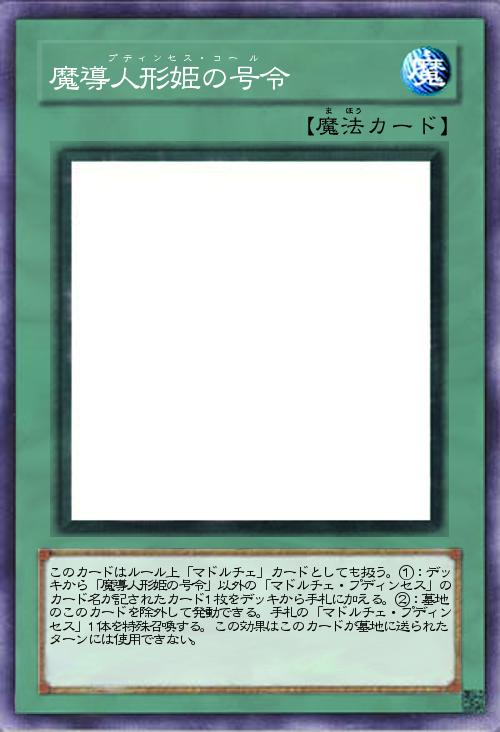 | このカードはルール上「マドルチェ」カードとしても扱う。①:デッキから「魔導人形姫の号令」以外の「マドルチェ・プディンセス」のカード名が記されたカード1枚をデッキから手札に加える。②:墓地のこのカードを除外して発動できる。手札の「マドルチェ・プディンセス」1体を特殊召喚する。この効果はこのカードが墓地に送られたターンには使用できない。 | |||