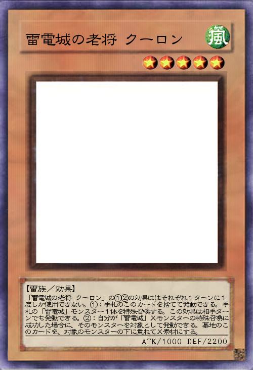 | 「雷電城の老将 クーロン」の①②の効果ははそれぞれ1ターンに1度しか使用できない。①:手札のこのカードを捨てて発動できる。手札の「雷電城」モンスター1体を特殊召喚する。この効果は相手ターンでも発動できる。②:自分が「雷電城」Xモンスターの特殊召喚に成功した場合に、そのモンスターを対象として発動できる。墓地のこのカードを、対象のモンスターの下に重ねてX素材にする。 | |||