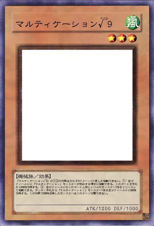 | 「マルティケーション√9」の①②の効果はそれぞれ1ターンに1度しか発動できない。①:自分フィールドに「マルティケーション」モンスターが存在する場合に発動できる。このカードを手札から特殊召喚する。②:自分フィールドのこのカードと同じレベルのモンスター1体をリリースして発動できる。デッキ・手札から「マルティケーション」モンスター1体を自分フィールドに特殊召喚する。この効果で特殊召喚したモンスターはこのターン攻撃できない。 | |||