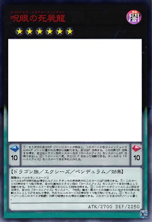 | 闇属性レベル6モンスター×2 レベル6がP召喚可能な場合にエクストラデッキの表側表示のこのカードはP召喚できる。①:このカードのX素材を1つ取り除き、自分の墓地のドラゴン族の「カースドアイズ」モンスター1体を対象として発動できる。そのモンスターを攻撃力を0にして特殊召喚する。②:このカードがフィールド上に存在する限り、自分の「カースドアイズ」モンスター、「呪恨」魔法・罠カードの発動コスト及びその効果の発動コストとしてLPを支払う場合、代わりにこのカードのX素材を1つ取り除いてもよい。③:モンスターゾーンのこのカードが戦闘・効果で破壊された場合に発動できる。このカードを自分のPゾーンに置く。 | |||