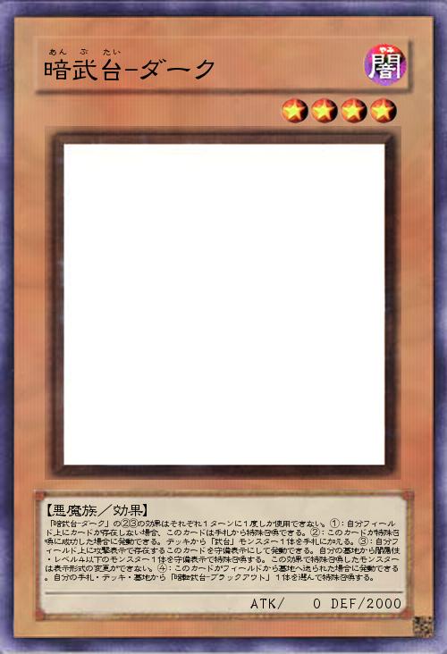| 「暗武台-ダーク」の②③の効果はそれぞれ1ターンに1度しか使用できない。 ①:自分フィールド上にカードが存在しない場合、このカードは手札から特殊召喚できる。②:このカードが特殊召喚に成功した場合に発動できる。デッキから「武台」モンスター1体を手札に加える。③:自分フィールド上に攻撃表示で存在するこのカードを守備表示にして発動できる。自分の墓地から闇属性・レベル4以下のモンスター1体を守備表示で特殊召喚する。この効果で特殊召喚したモンスターは表示形式の変更ができない。④:このカードがフィールドから墓地へ送られた場合に発動できる。自分の手札・デッキ・墓地から「暗転武台-ブラックアウト」1体を選んで特殊召喚する。 | |||