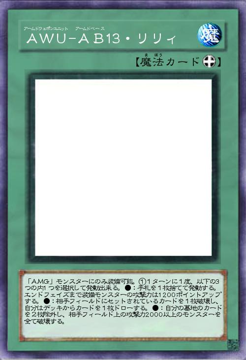| 「AMG」モンスターにのみ装備可能。①1ターンに1度、以下の3つの内1つを選択して発動出来る。●:手札を1枚捨てて発動する。エンドフェイズまで装備モンスターの攻撃力は1200ポイントアップする。●:相手フィールドにセットされているカードを1枚破壊し、自分はデッキからカードを1枚ドローする。●:自分の墓地のカードを2枚除外し、相手フィールド上の攻撃力2000以上のモンスターを全て破壊する。 | |||