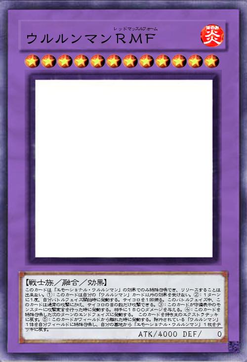 | このカードは「エモーショナル・ウルルンマン」の効果でのみ特殊召喚でき、リリースすることは出来ない。①:このカードは自分の「ウルルンマン」カード以外の効果を受けない。②:1ターンに1度、自分バトルフェイズ開始時に発動する。サイコロを1回振る。このバトルフェイズ中、このカードは通常の攻撃に加え、サイコロの目の数だけ攻撃できる。③:このカードが守備表示のモンスターに攻撃宣言を行った時に発動する。相手に1500ダメージを与える。④:このカードを特殊召喚した次のターンのエンドフェイズに発動する。 このカードを持ち主のエクストラデッキに戻す。⑤:このカードがフィールドから離れた時に発動する。除外されている「ウルルンマン」1体を自分フィールドに特殊召喚し、自分の墓地から「エモーショナル・ウルルンマン」1枚をデッキに戻す。 | |||
