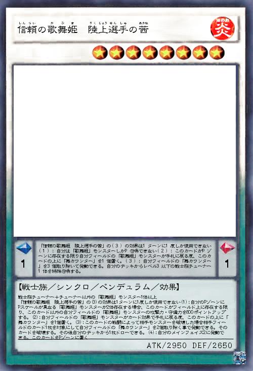 | 戦士族チューナー+チューナー以外の「歌舞姫」モンスター1体以上 「信頼の歌舞姫 陸上選手の茜」の(3)の効果は1ターンに1度しか使用できない(1):自分のPゾーンにPスケールが異なる「歌舞姫」モンスターが2体存在する場合、このカードがフィールド上に存在する限り、このカード以外の自分フィールドの「歌舞姫」モンスターの攻撃力・守備力を800ポイントアップする。(2):自分フィールドの「歌舞姫」モンスターがカード効果で手札に戻る度、このカードの上に「舞カウンター」を1個置く。(3):このカードの戦闘によって相手モンスターを破壊した場合相手フィールドのカード1枚を対象にして自分フィールドの「舞カウンター」を2個取り除く事で発動できる。そのカードを破壊する。その後自分のデッキから1枚ドローできる。(4):自分のメインフェイズ2に発動できる。このカードをPゾーンに置く | |||