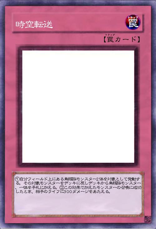 | ①自分フィールド上にある鳥類族モンスター2体を対象として発動する。その対象モンスターをデッキに戻しデッキから鳥類族モンスター、一体を手札に加える。②この効果で加えたモンスターの召喚に成功したとき、相手のライフに300ダメージをあたえる。 | |||