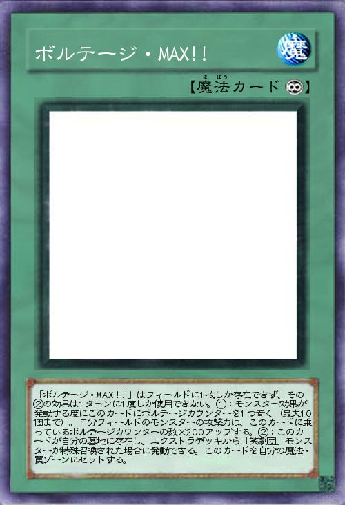 | 「ボルテージ・MAX!!」はフィールドに1枚しか存在できず、その②の効果は1ターンに1度しか使用できない。①:モンスター効果が発動する度にこのカードにボルテージカウンターを1つ置く(最大10個まで)。自分フィールドのモンスターの攻撃力は、このカードに乗っているボルテージカウンターの数×200アップする。②:このカードが自分の墓地に存在し、エクストラデッキから「笑劇団」モンスターが特殊召喚された場合に発動できる。このカードを自分の魔法・罠ゾーンにセットする。 | |||