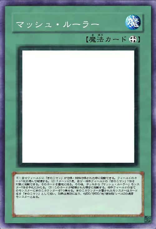 | (1):自分フィールドに「きのこマン」が召喚・特殊召喚された時に発動できる。フィールドのカード1枚を選んで破壊する。(2):1ターンに1度、自分・相手フィールドの「きのこマン」1体を対象に発動できる。そのカードを墓地に送る。その後、デッキから「マッシュ・ルーラー」モンスター1体を手札に加える。(3):このカードが破壊された場合に発動する。相手フィールドの全てのモンスターにきのこカウンターを1つ乗せる。きのこカウンターが置かれたモンスターはカード名を「きのこマン」として扱い、効果は無効になり、攻800/守600/地/植物族の通常モンスターとなる。 | |||