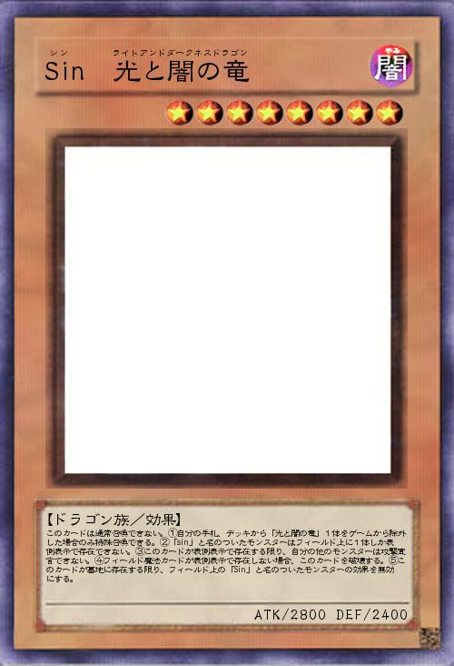 | このカードは通常召喚できない。①自分の手札、デッキから「光と闇の竜」1体をゲームから除外した場合のみ特殊召喚できる。②「sin」と名のついたモンスターはフィールド上に1体しか表側表示で存在できない。③このカードが表側表示で存在する限り、自分の他のモンスターは攻撃宣言できない。④フィールド魔法カードが表側表示で存在しない場合、このカードを破壊する。⑤このカードが墓地に存在する限り、フィールド上の「Sin」と名のついたモンスターの効果を無効にする。 | |||