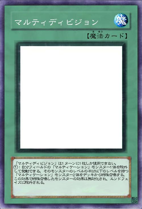 | 「マルティディビジョン」は1ターンに1枚しか使用できない。 ①:自分フィールドの「マルティケーション」モンスター1体を除外して発動できる。そのモンスターのレベルの半分以下のレベルを持つ「マルティケーション」モンスター2体をデッキから特殊召喚する。この効果で特殊召喚したモンスターの効果は無効化され、エンドフェイズに除外される。 | |||