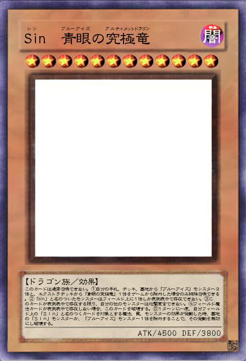 | このカードは通常召喚できない。①自分の手札、デッキ、墓地から「ブルーアイズ」モンスター3体と、エクストラデッキから「青眼の究極竜」1体をゲームから除外した場合のみ特殊召喚できる。②「sin」と名のついたモンスターはフィールド上に1体しか表側表示で存在できない。③このカードが表側表示で存在する限り、自分の他のモンスターは攻撃宣言できない。④フィールド魔法カードが表側表示で存在しない場合、このカードを破壊する。⑤1ターンに一度、自分フィールド上の「Sin」と名のつくカードを対象とする魔法、罠、モンスターの効果が発動した時、墓地の「Sin」モンスターか、「ブルーアイズ」モンスター1体を除外することで、その発動を無効にし破壊する。 | |||
