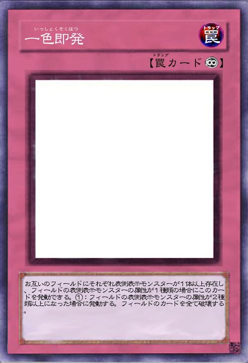 | お互いのフィールドにそれぞれ表側表示モンスターが1体以上存在し、フィールドの表側表示モンスターの属性が1種類の場合にこのカードを発動できる。①:フィールドの表側表示モンスターの属性が2種類以上になった場合に発動する。フィールドのカードを全て破壊する。 | |||