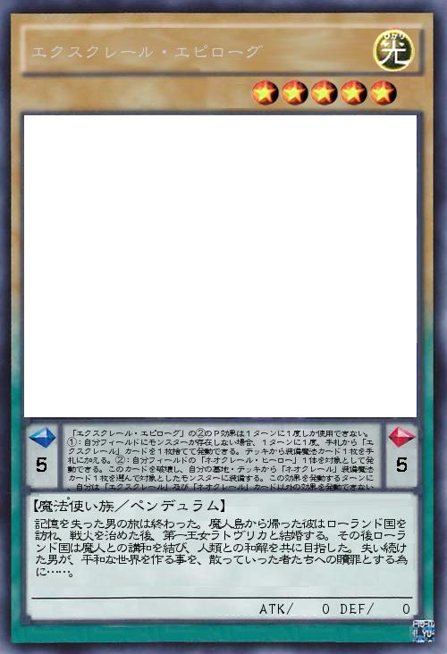 「ペンデュラムモンスターは通常モンスターにすれば効果を持ちつつフレーバーテキストで背景設定を語れるのがオリカ的に助かりますね。ただ詰め込み過ぎてはみ出ますね、困りますね。P効果は始動か詰めの状況でしか使えないので、基本的に腐ります。自身のPスケールじゃ同名カードのP召喚もできません。以下設定はテキストを見てください。名前の通り、「エクスクレール」はこれでおしまいです。ありがとうございました。」(2016-09-29 09:01)