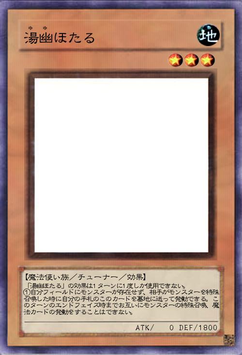 | 「湯幽ほたる」の効果は1ターンに1度しか使用できない。 ①自分フィールドにモンスターが存在せず、相手がモンスターを特殊召喚した時に自分の手札のこのカードを墓地に送って発動できる。このターンのエンドフェイズ時までお互いにモンスターの特殊召喚、魔法カードの発動をすることはできない。 | |||