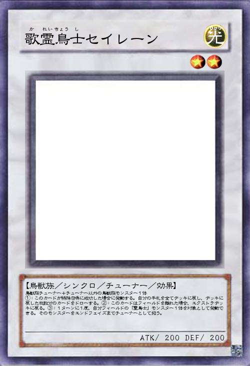 | 鳥獣族チューナー+チューナー以外の鳥獣族モンスター1体 ①:このカードが特殊召喚に成功した場合に発動する。自分の手札を全てデッキに戻し、デッキに戻した枚数分のカードをドローする。②:このカードはフィールドを離れた場合、エクストラデッキに戻る。③:1ターンに1度、自分フィールドの「霊鳥士」モンスター1体を対象として発動できる。そのモンスターをエンドフェイズまでチューナーとして扱う。 | |||