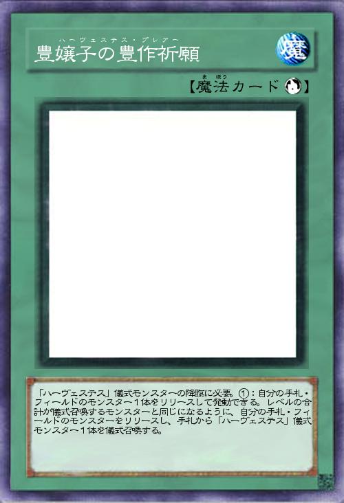 | 「ハーヴェステス」儀式モンスターの降臨に必要。①:自分の手札・フィールドのモンスター1体をリリースして発動できる。レベルの合計が儀式召喚するモンスターと同じになるように、自分の手札・フィールドのモンスターをリリースし、手札から「ハーヴェステス」儀式モンスター1体を儀式召喚する。 | |||