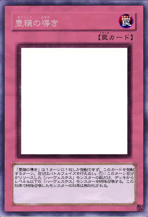 | 「豊穣の導き」は1ターンに1枚しか発動できず、このカードを発動するターン、自分はバトルフェイズを行えない。①:このターン自分がリリースした「ハーヴェステス」モンスターの数だけ、デッキからレベル4以下の「ハーヴェステス」モンスターを特殊召喚する。この効果で特殊召喚したモンスターの効果は無効化される。 | |||